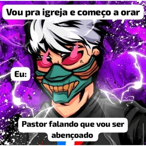 Um personagem de anime com cabelo branco e máscara verde, olhos rosados, em um fundo roxo com raios. Ele diz 'Vou pra igreja e começo a orar' e 'Pastor falando que vou ser abençoado', com uma expressão irônica.