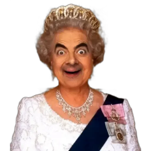 Rainha Elizabeth II com expressão surpresa e olhos arregalados, usando tiara e joias, com uma faixa azul e broche rosa sobre o ombro.
