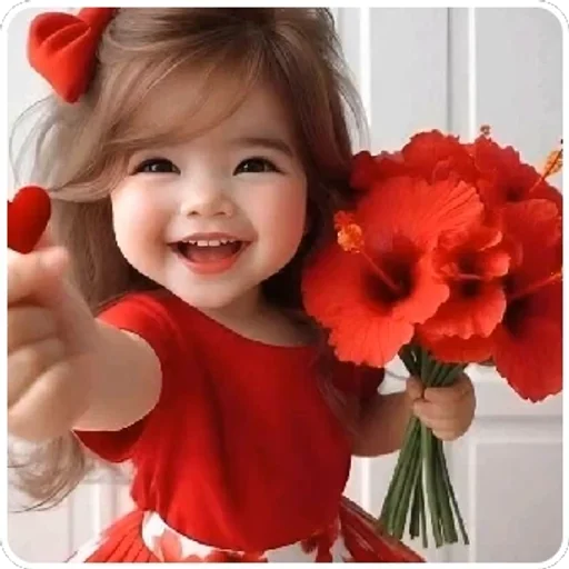 Menina loira sorrindo e oferecendo uma rosa vermelha, vestida com um vestido vermelho e um laço vermelho no cabelo, segurando um buquê de flores vermelhas.