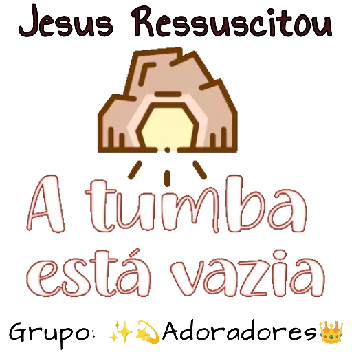 Uma tumba vazia com uma luz saindo dela, com o texto 'Jesus Ressuscitou' e 'A tumba está vazia' em português, e 'Grupo: Adoradores' abaixo.