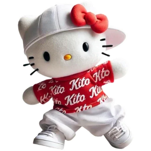 Hello Kitty vestida com um boné cinza, óculos pretos, um colar de contas brancas, uma camisa vermelha com a palavra 'Kito' escrita várias vezes, calças brancas e sapatos brancos.