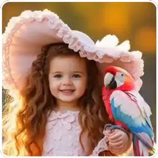 Menina sorrindo com um papagaio colorido no ombro e um chapéu rosa com renda.
