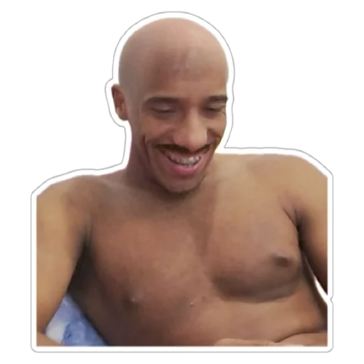 Homem careca e sem camisa com um sorriso largo e dentes separados, parecendo feliz e relaxado.