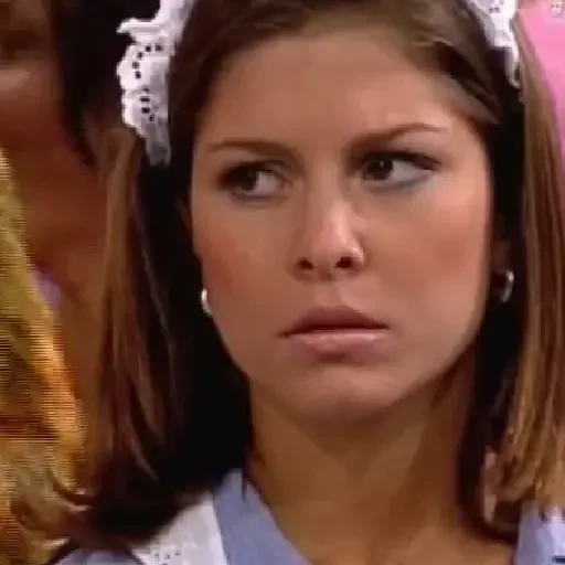 Rosto de uma mulher com expressão de surpresa ou preocupação, usando um laço branco no cabelo.