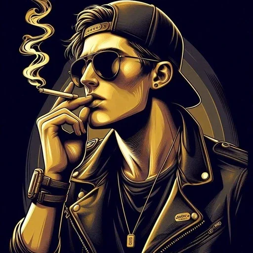 Um homem com óculos escuros e boné, fumando um cigarro com uma expressão relaxada, vestindo uma jaqueta de couro e um medalhão no pescoço.