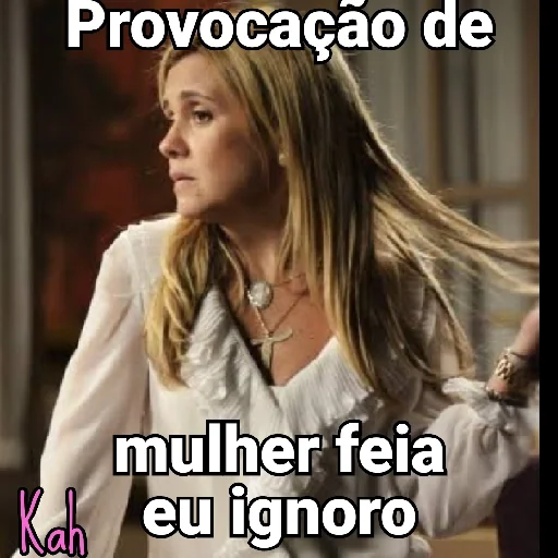 Uma mulher loira com expressão séria e um pouco altiva, vestida com uma blusa branca. A imagem traz o texto 'Provocação de mulher feia eu ignoro'.