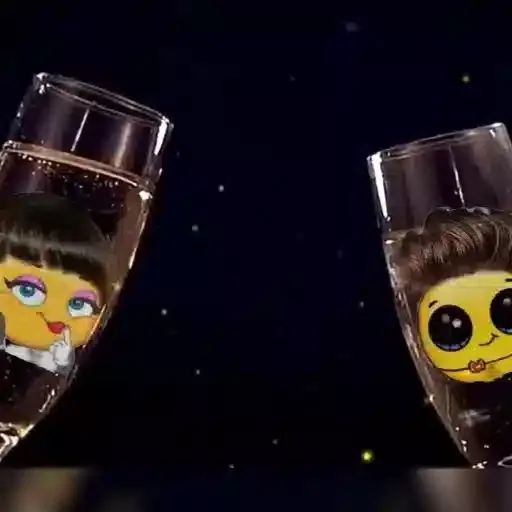 Duas taças de champanhe com rostos de personagens animados, um com cabelo preto e olhos azuis e o outro com cabelo castanho e olhos grandes, contra um fundo escuro com estrelas.