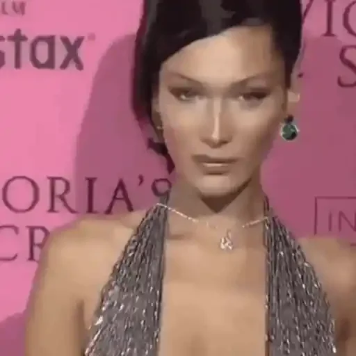 Mulher com cabelo preto e vestido prateado em frente a um fundo rosa com texto. Ela está usando brincos verdes e um colar.