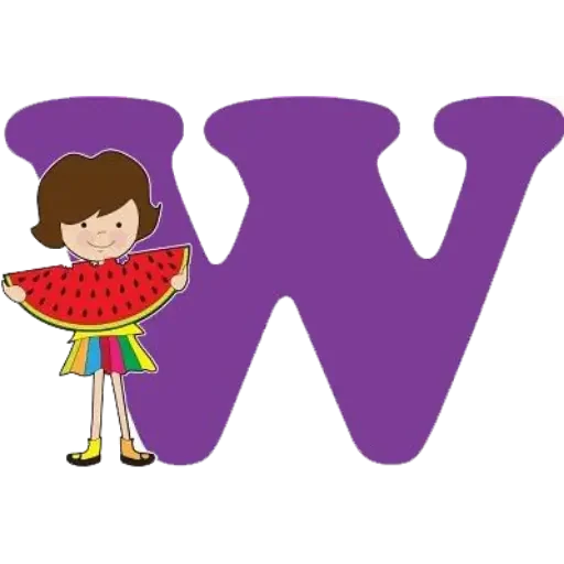 Menina de cabelo castanho segurando uma fatia de melancia em frente a uma letra W roxa.