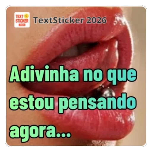 Lábios vermelhos com a boca semi-aberta e um texto em verde que diz 'Adivinha no que estou pensando agora...'.