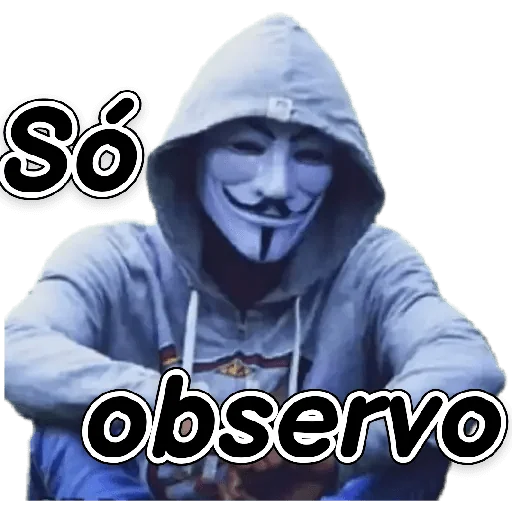 Rosto de uma pessoa com máscara branca e capuz, olhos azuis brilhantes, fundo escuro. OBSERVANDO TD!