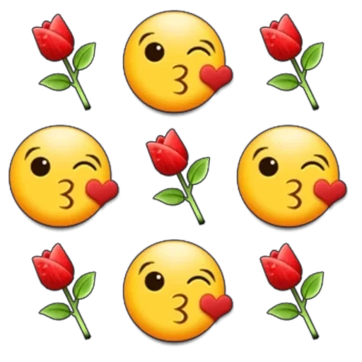 Seis emojis de rosto amarelo com expressões de beijo e amor, rodeados de rosas vermelhas.