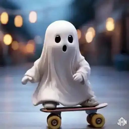Um fantasma branco e assustado está em pé em um skate, com olhos pretos grandes e uma boca aberta em choque. O fundo é desfocado com luzes quentes.