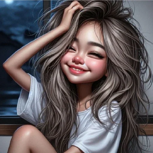 Uma jovem mulher com cabelos longos e ondulados cor de cinza, vestindo uma camiseta branca, sentada à noite com um sorriso tímido e corada, passando a mão pelos cabelos.