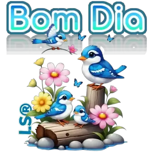 Três pássaros azuis em um tronco com flores coloridas, sendo uma amarela e duas rosas. O texto 'Bom Dia' aparece na parte superior.