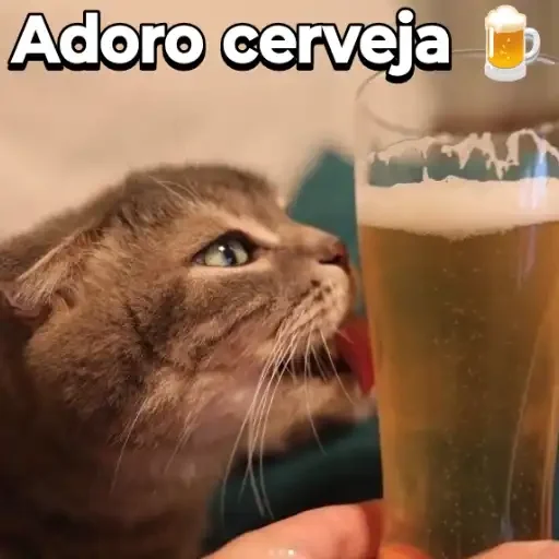 Um gato cinza olha para uma cerveja gelada em um copo, com a frase 'Adoro cerveja' escrita acima.