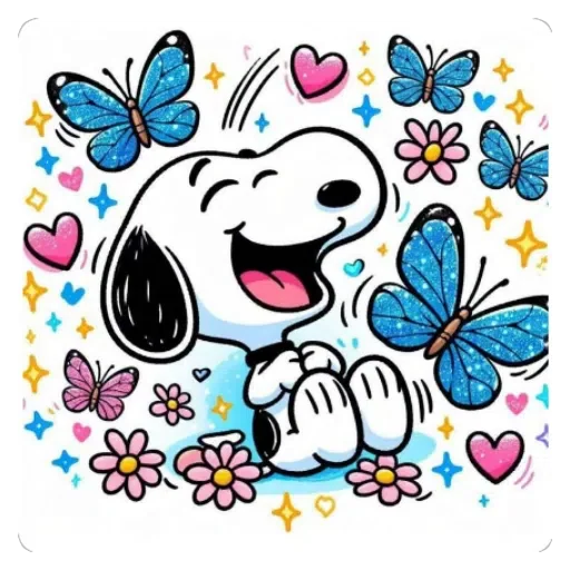 Snoopy com um sorriso no rosto segura uma jarra de vidro com borboletas coloridas saindo dela. As borboletas são azuis…