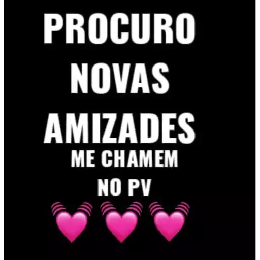 Um sticker com texto em branco sobre fundo preto que diz 'PROCURO NOVAS AMIZADES ME CHAMEM NO PV' e três corações rosa com linhas onduladas.