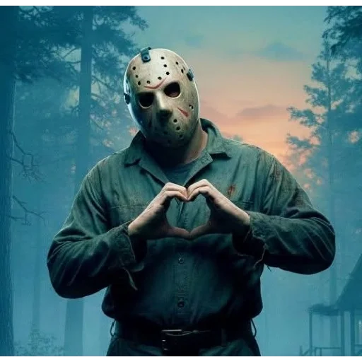 Jason Voorhees, do filme Sexta-Feira 13, fazendo um gesto de coração com as mãos enquanto usa uma máscara de hóquei e uma camisa verde escura, em um cenário de floresta nebulosa ao pôr do sol.