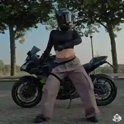 Uma mulher de meia-lua usando um capacete de moto e roupas casuais dança em frente a uma moto preta em uma rua com árvores ao fundo.