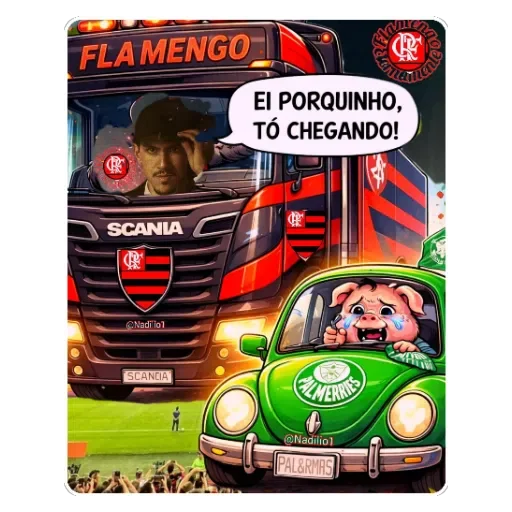 Um desenho de um carro verde com um porquinho ao volante e um ônibus grande ao fundo, com o texto 'Ei porquinho, tô chegando!' em uma bolha de fala. O ônibus tem 'FLA MENGO' escrito em laranja no topo.