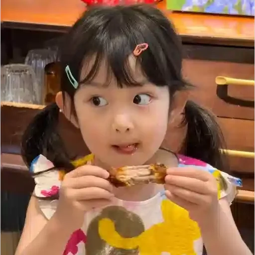 Menina com cabelos pretos e dois rabos de cavalo, usando uma tiara, segura um pedaço de comida na frente da boca, com expressão surpresa.