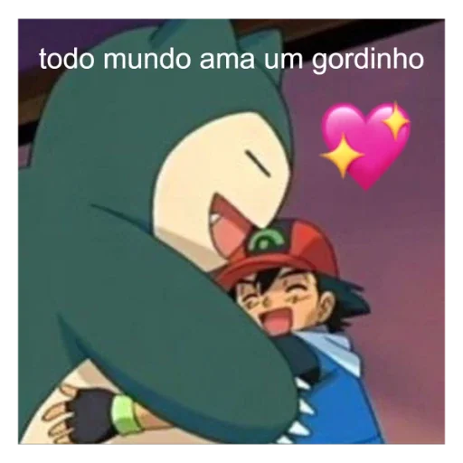 Um menino de chapéu vermelho é abraçado por um grande monstro verde, com texto 'todo mundo ama um gordinho' e um coração rosa.