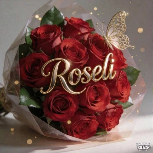 Um buquê de rosas vermelhas com o nome 'Roseli' em letras douradas no centro. O buquê é envolvido em papel transparente e decorado com uma borboleta dourada e pontos de luz.