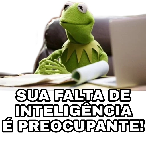 Kermit, o sapo do Muppet, sentado em frente a um computador com uma expressão séria, acompanhado do texto 'SUA FALTA DE INTELIGÊNCIA É PREOCUPANTE!'
