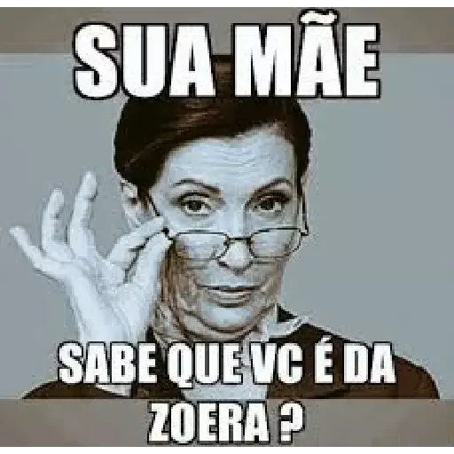 Imagem em preto e branco de uma mulher com expressão cética, mão perto do rosto, com texto 'SUA MÃE SABE QUE VC É DA ZOERA ?'