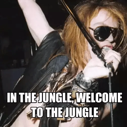 Uma mulher com cabelos castanhos e óculos de sol está cantando em um microfone com uma expressão intensa. Ela veste uma roupa preta e tem o braço levantado. A imagem traz o texto 'IN THE JUNGLE, WELCOME TO THE JUNGLE'.