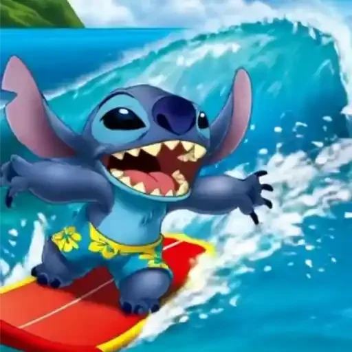 Stitch de Lilo & Stitch surfando em uma prancha vermelha em uma onda azul, com expressão de dentes arreganhados e olhos arregalados.