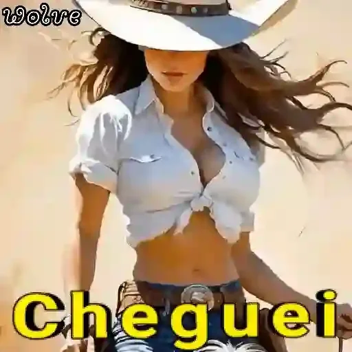 Uma mulher loira usando um chapéu de cowboy e uma camisa branca desabotoada com o texto 'Cheguei' em destaque na parte inferior.
