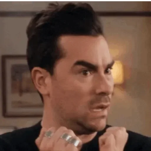 Homem com expressão séria e mãos levantadas, usando anéis, em ambiente com quadro ao fundo.