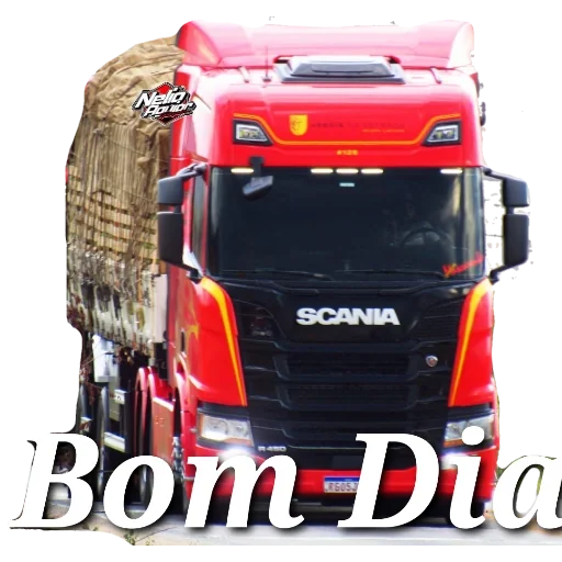 Um caminhão vermelho da marca Scania com uma carga na carroceria, tendo o texto 'Bom Dia' na parte inferior.