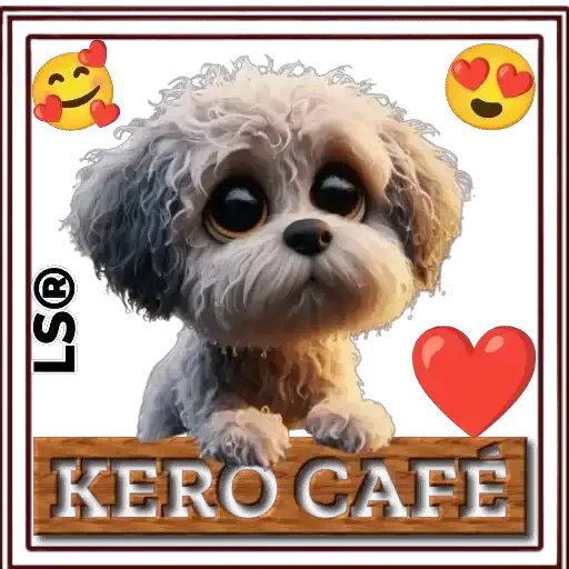 Cachorro fofo com olhos grandes e pelagem cinza e branca, com um coração vermelho e emojis de amor ao redor. Abaixo dele, há uma faixa de madeira com o texto 'KERO CAFÉ'.