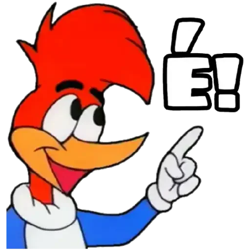 Personagem de desenho animado de um pássaro vermelho com bico laranja, apontando para a direita e dizendo 'É!'