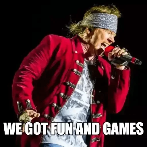 Imagem de um homem loiro, com bandana cinza na cabeça e jaqueta vermelha, cantando em um microfone com o texto 'WE GOT FUN AND GAMES' sobreposto.