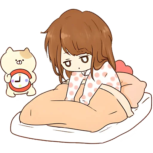 Uma menina deitada na cama com um pijama de flores rosa, ao lado de um gato que segura um relógio. Ela parece sonolenta e contrariada.