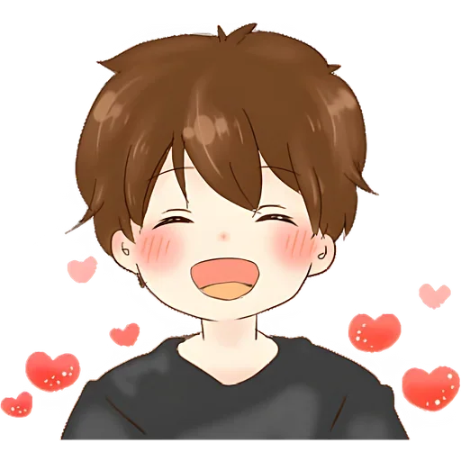 Um menino com cabelo castanho e bochechas rosadas, sorrindo com olhos fechados, rodeado de corações vermelhos.