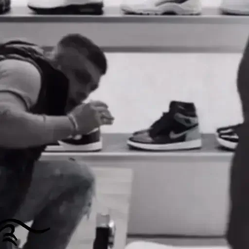 Um homem ajoelhado diante de uma prateleira de sapatos, examinando um par.