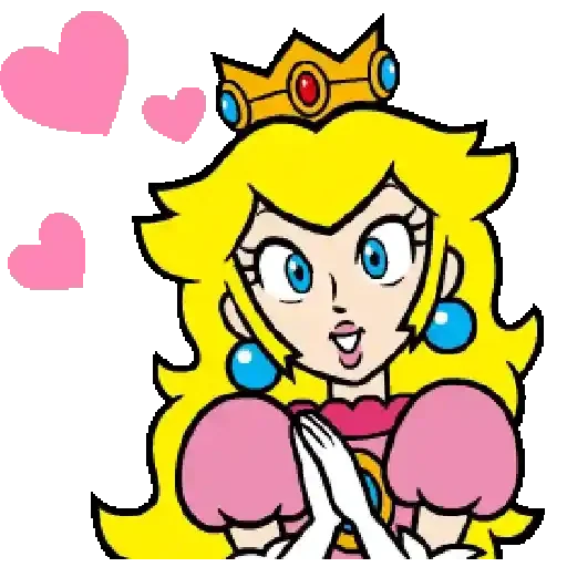 Princesa Peach com coroa dourada e joias azuis, cabelo loiro e olhos azuis, vestindo uma blusa rosa. Ela está com as mãos juntas e uma expressão fofa, cercada de corações rosa.