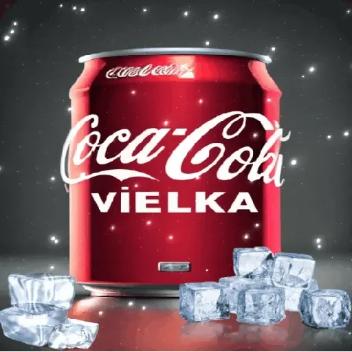 Lata de Coca-Cola com gelo ao redor, fundo escuro com faíscas. A lata tem o logotipo da Coca-Cola e o texto 'VIELKA' embaixo.