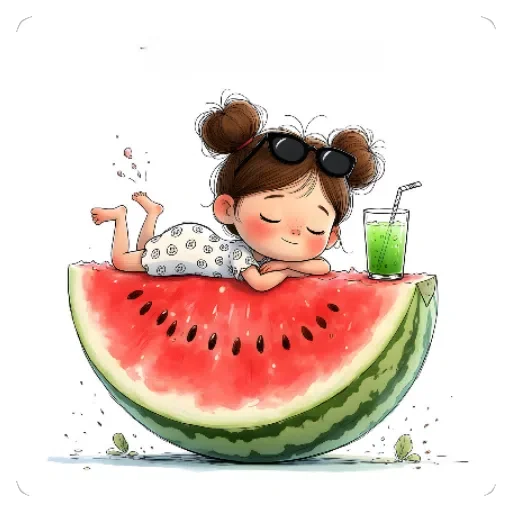 Menina de óculos de sol deitada em uma fatia de melancia com um copo de suco verde.
