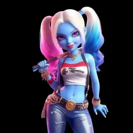 Uma imagem colorida de Harley Quinn com penteados rosa e azul, maquiagem pesada e um colete vermelho. Ela está com um…