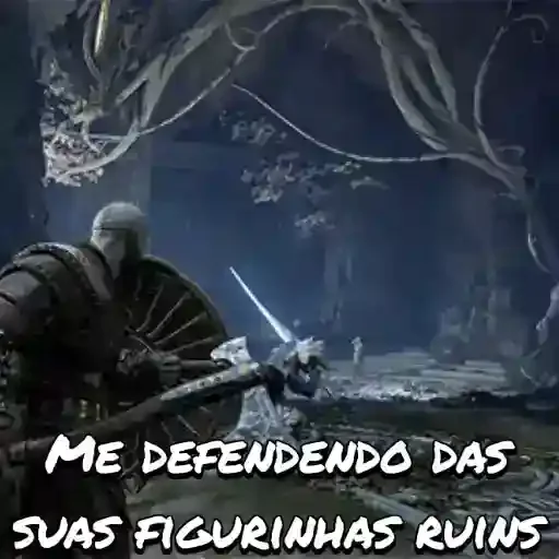 Um guerreiro com armadura e espada em uma cena sombria, com texto 'Me defendendo das suas figurinhas ruins'.