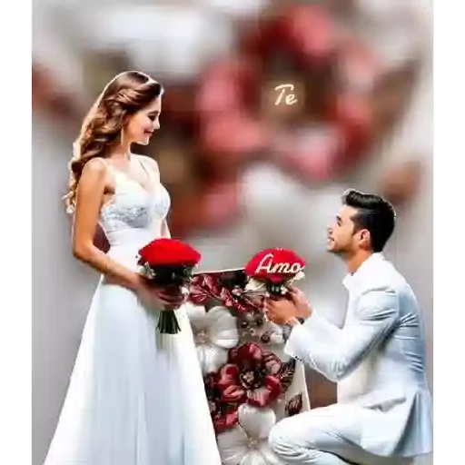 Um homem de terno branco ajoelhado diante de uma mulher de vestido branco, oferecendo-lhe um buquê de flores vermelhas. Atrás deles, um arranjo de flores e um coração.