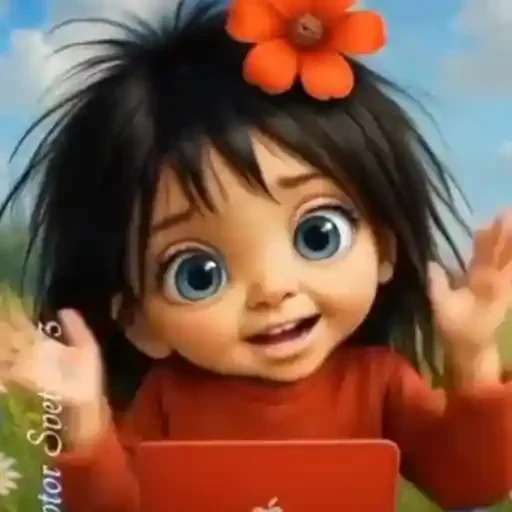 Menina de olhos azuis e cabelos pretos com uma flor laranja no cabelo, usando um casaco vermelho e com um tablet laranja. Ela parece surpresa ou feliz.