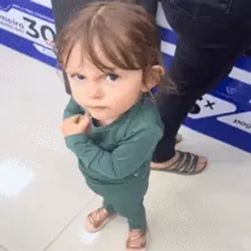 Menina pequena com expressão séria, vestida com roupa verde, em pé com uma mão perto do rosto.