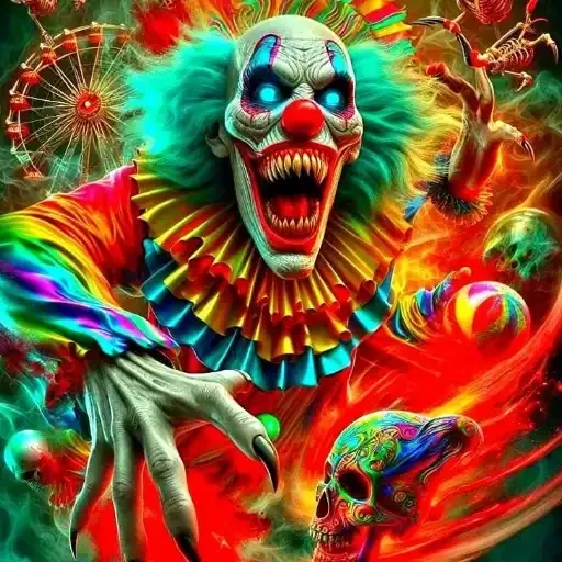 Palhaço de circo com olhos azuis e expressão assustadora, com cabelo verde e roupa colorida. Fundo com carrossel e caveira.